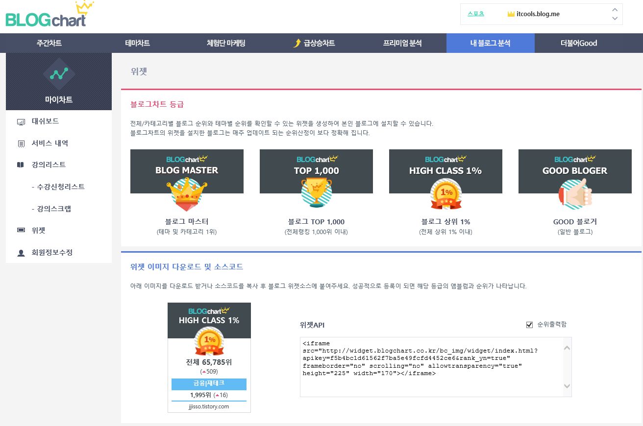 그리고 제 블로그의 순위와 관련된 정보를 위젯으로 등록도 할 수 있습니다. 사이드바나 블로그 하단에 소스코드를 복사해서 붙여넣기만 하면되는데요..