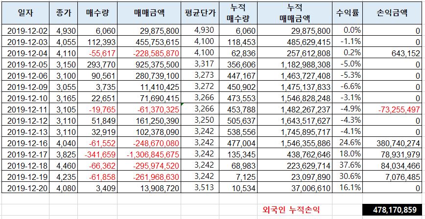 제가 계산해본 방법이 맞다면 외국인의 투자방법은 정말 대단하다라는 것 밖에 할 말이 없습니다. ㅎㅎ 일단 계산 방법은 폭락을 했던 12월2일부터 시작합니다. 계산 방법이 조금 복잡할 수 있지만, 12월2일부터 매수를 했을 경우 평균단가를 산출하였고, 매도를 했을 때는 전일 평균단가를 기준으로 실제 거래가 일어난 것이기 때문에 매도손익금액을 산출해 봤습니다.