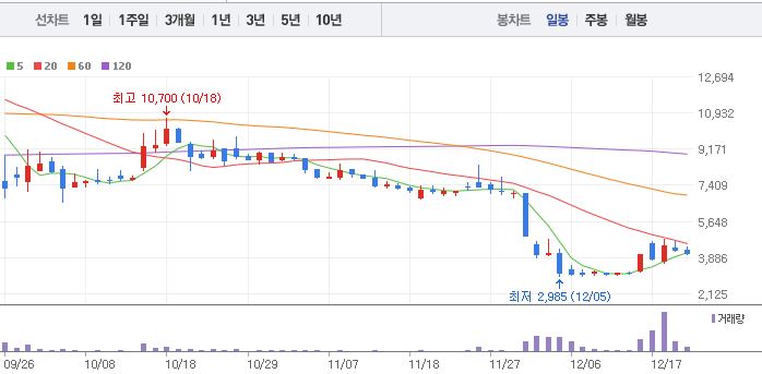 이런 모습은 고스란히 주가에도 반영이 되고 있는 모습입니다. 주봉으로 볼때 8월말 15,050원까지 최고가를 찍었던 종목이 현재 4,000원정도에서 거래가 되고 있고, 무려 74%정도가 하락된 상태입니다. 12월 첫째주에 56%의 하락률을 기록했으며, 11월말까지 7천원이던 주가가 반토막이상 나면서 최저 2,985원까지 하락을 했고, 막판 힘을 주면서 오르락 내리락을 반복하고 있습니다.