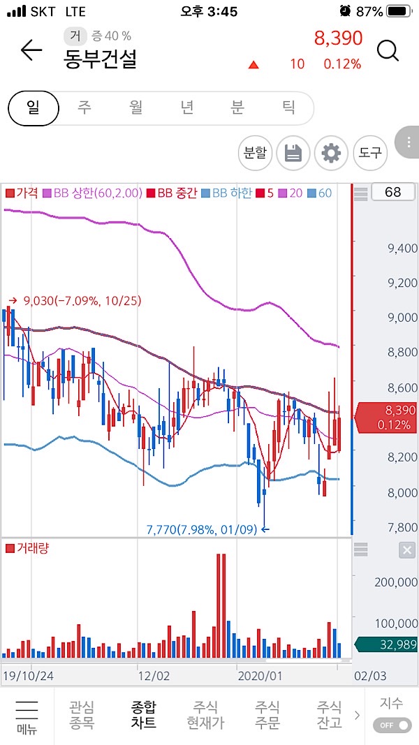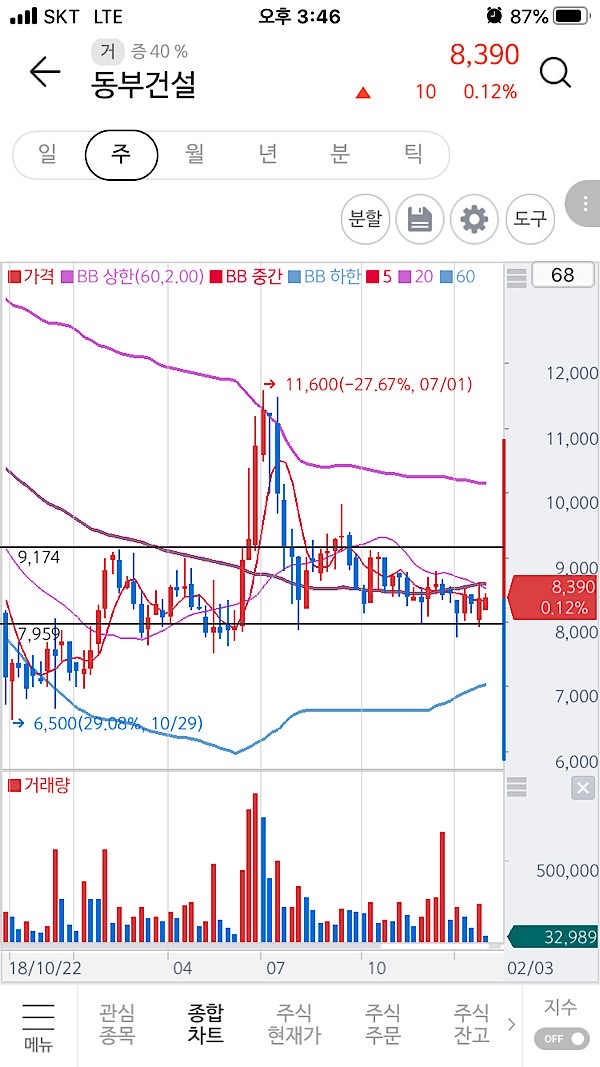 동부건설은 조건검색식으로 발견된 주식종목들 중에서 이래저래 차트를 보다가 선정한 종목으로, 차트상에 의미있는 모습들이 많이 있어 매수를 하게되었습니다.