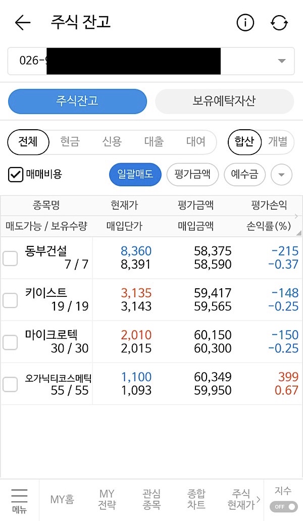 자! 그럼 2월도 시장이 좋건 말건간에 한번 주식투자 단타의 실전모의투자를 진행해보도록 하겠습니다. 위의 우측 이미지에서 보듯이 저는 2/3일 동부건설, 키이스트, 마이크로텍, 오가닉티코스메틱 4개의 주식종목을 매수하였습니다.