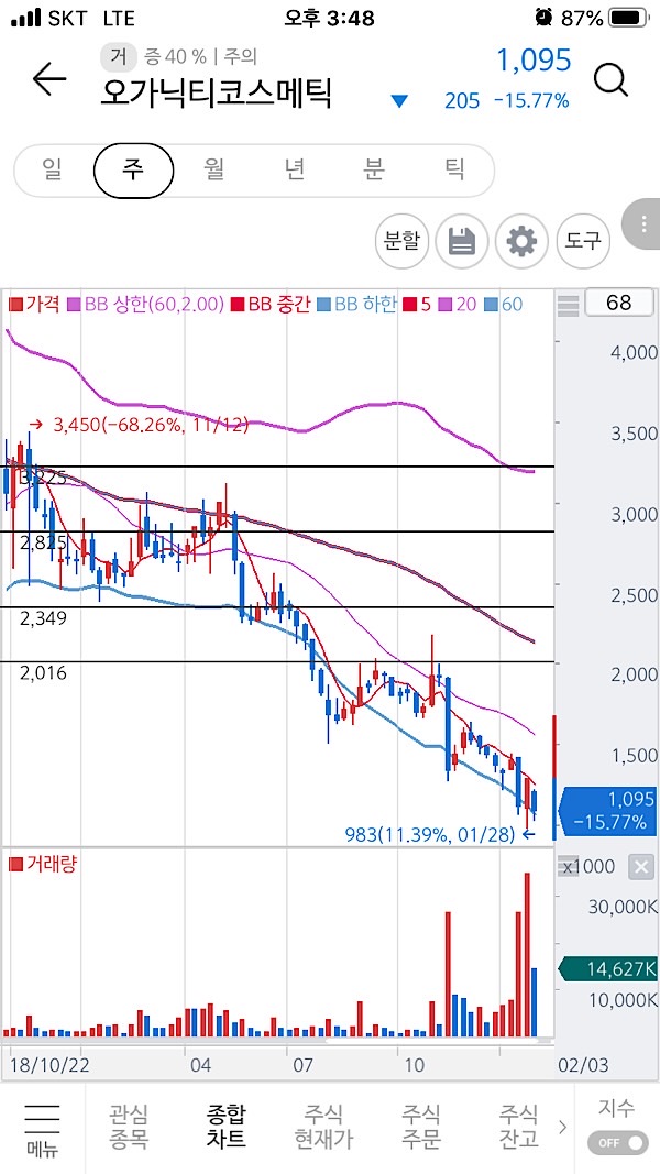 일단 일봉상으로 25%까지 상승했다가 15%까지 빠지는 등 롤러코스터를 주가가 타고 있는 상황이며, 제가 기대를 걸고 있는 것은 최근에 엄청난 주가 거래가 하락세의 마지막일 것이라는 기대감(?)으로 매수를 진행하였습니다.