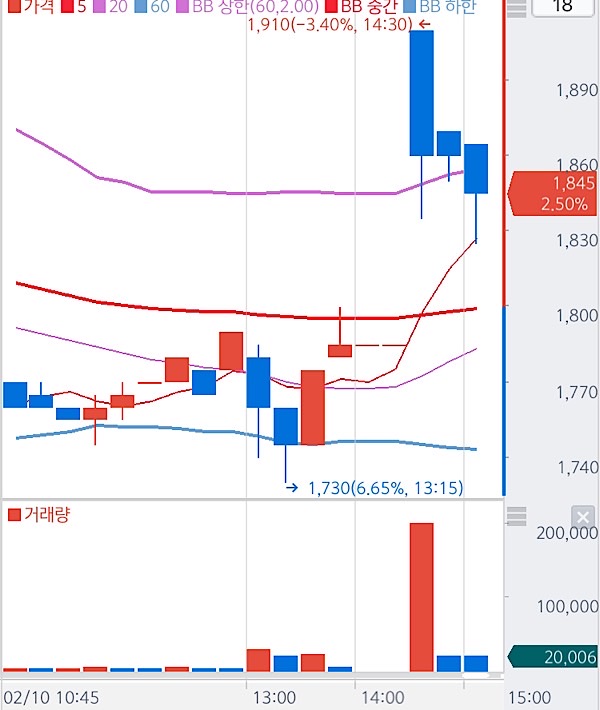 그리고 분봉상 갑자기 수급이 유입되면서 거래가 살아있음을 암시하는 형태의 차트모양이 등장을 했기 때문에 좀 더 지켜보기로 했습니다.