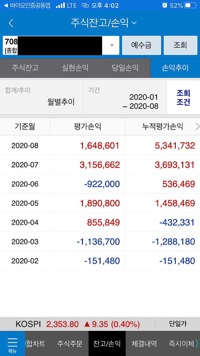 제가 예전에 한국투자증권과 카카오뱅크의 이벤트로 받은 KOSPI200 중 1개의 종목이 있었고, 1주를 줬기 때문에 1만원도 되지 않는 주식을 받아서 이거 받은거에만 의의를 둬야겠다하고 한두달에 한번 가끔 생각날때 들어가서 어찌되었나 구경을 했습니다.