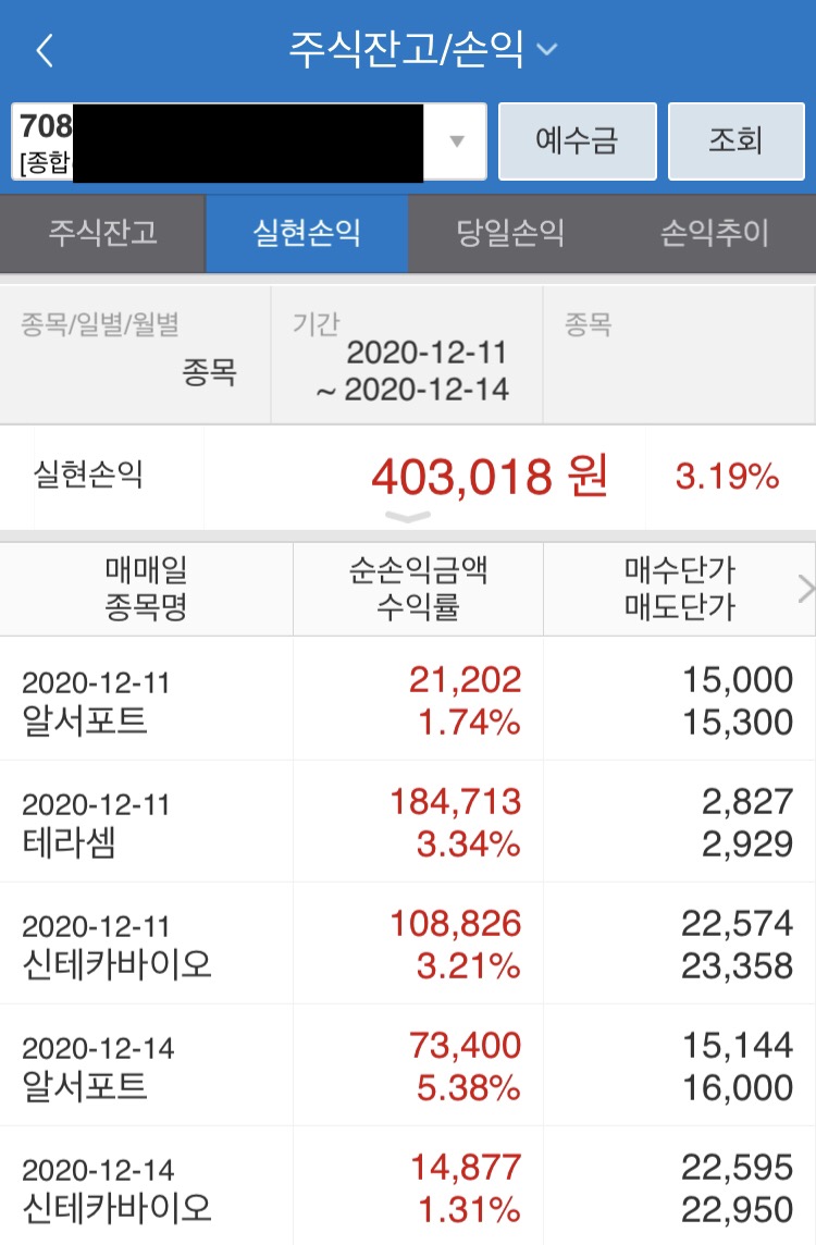 대웅, 신테카바이오, 테라셈, 알서포트 등 단타 매매수익 : +86만원