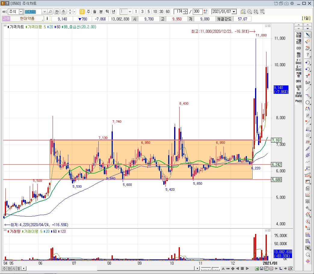 현대약품은 '20.6월부터 시작해서 장기간 횡보를 진행하던 주식종목이고, 이렇게 횡보하던 주식종목이 급등이 나왔다는 이야기는 그간의 주가구간동안 매집세력이 있었다는 이야기로 해석해볼 수 있습니다.