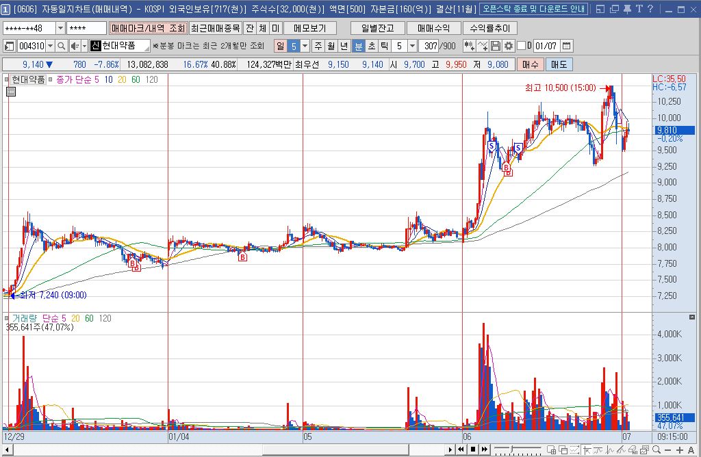 현대약품의 주가가 재차 급락세를 연출을 한 이후에 다시 상승흐름으로 돌아섰고, 5봉이평을 돌파하는 순간 일차적인 매수가 들어갔습니다. 대부분의 물량을 저순간 집어 넣습니다. 60%정도되는 물량이죠