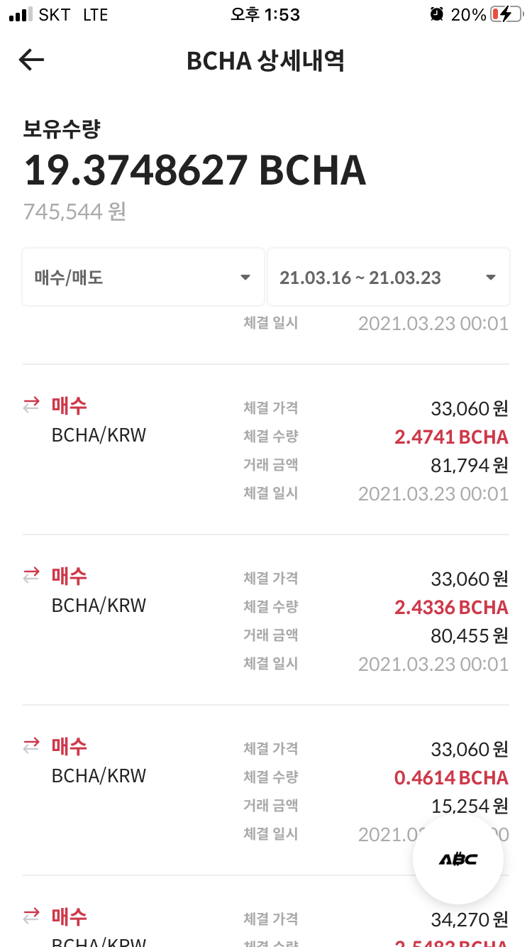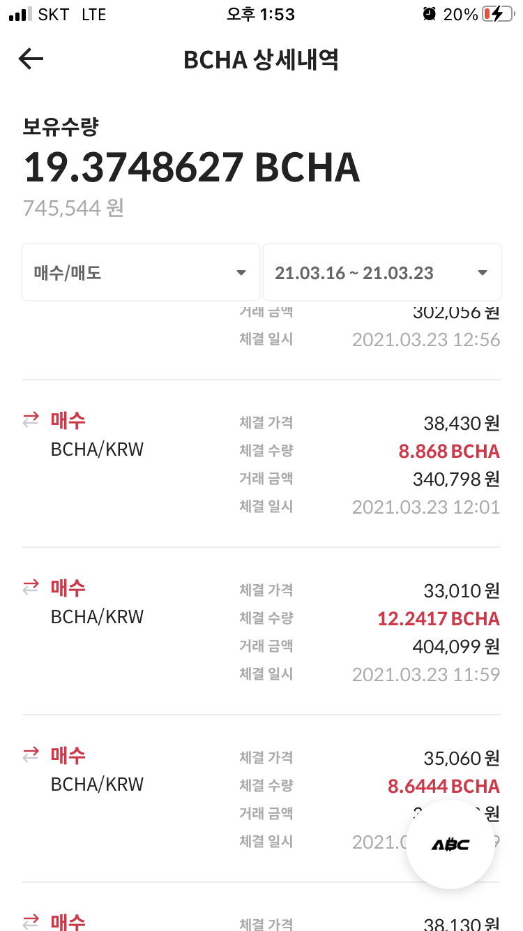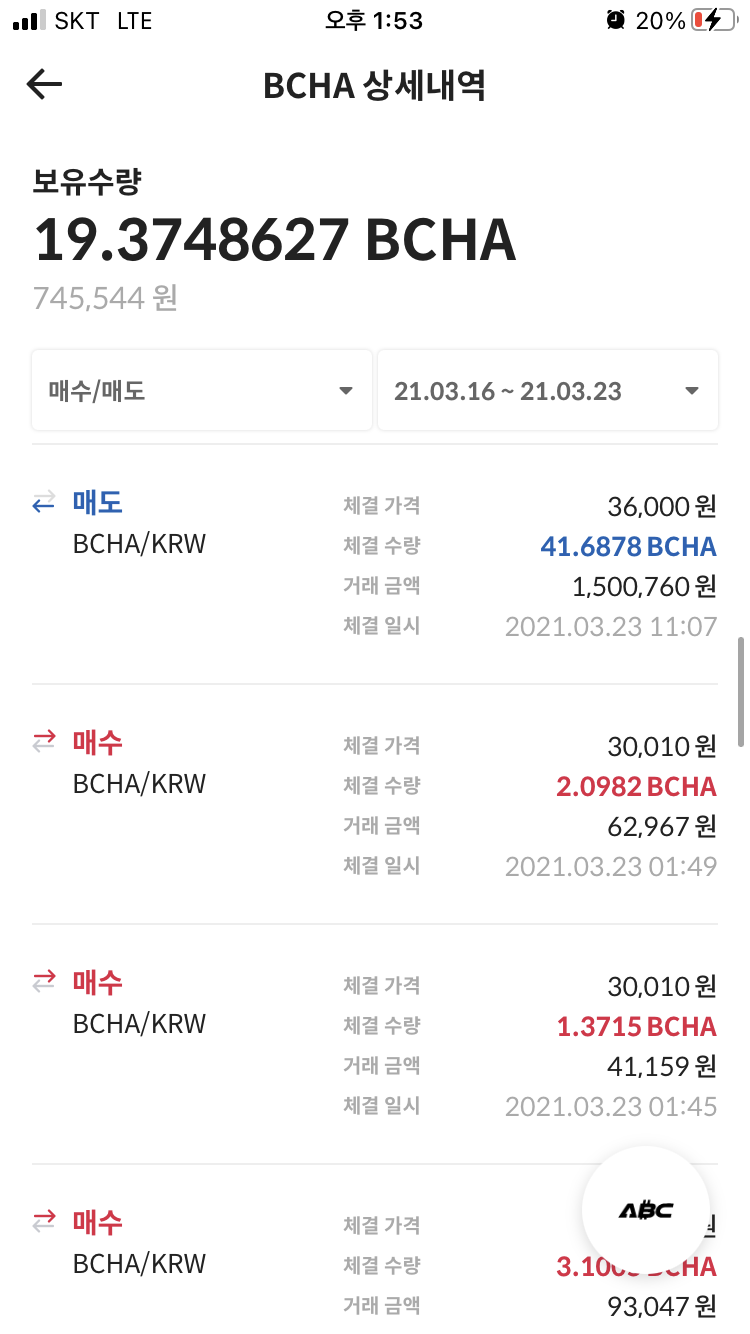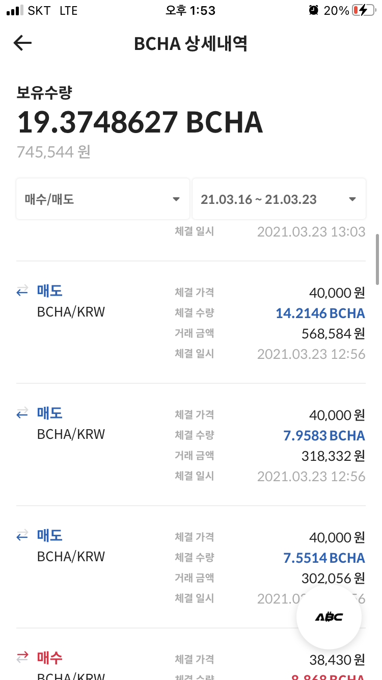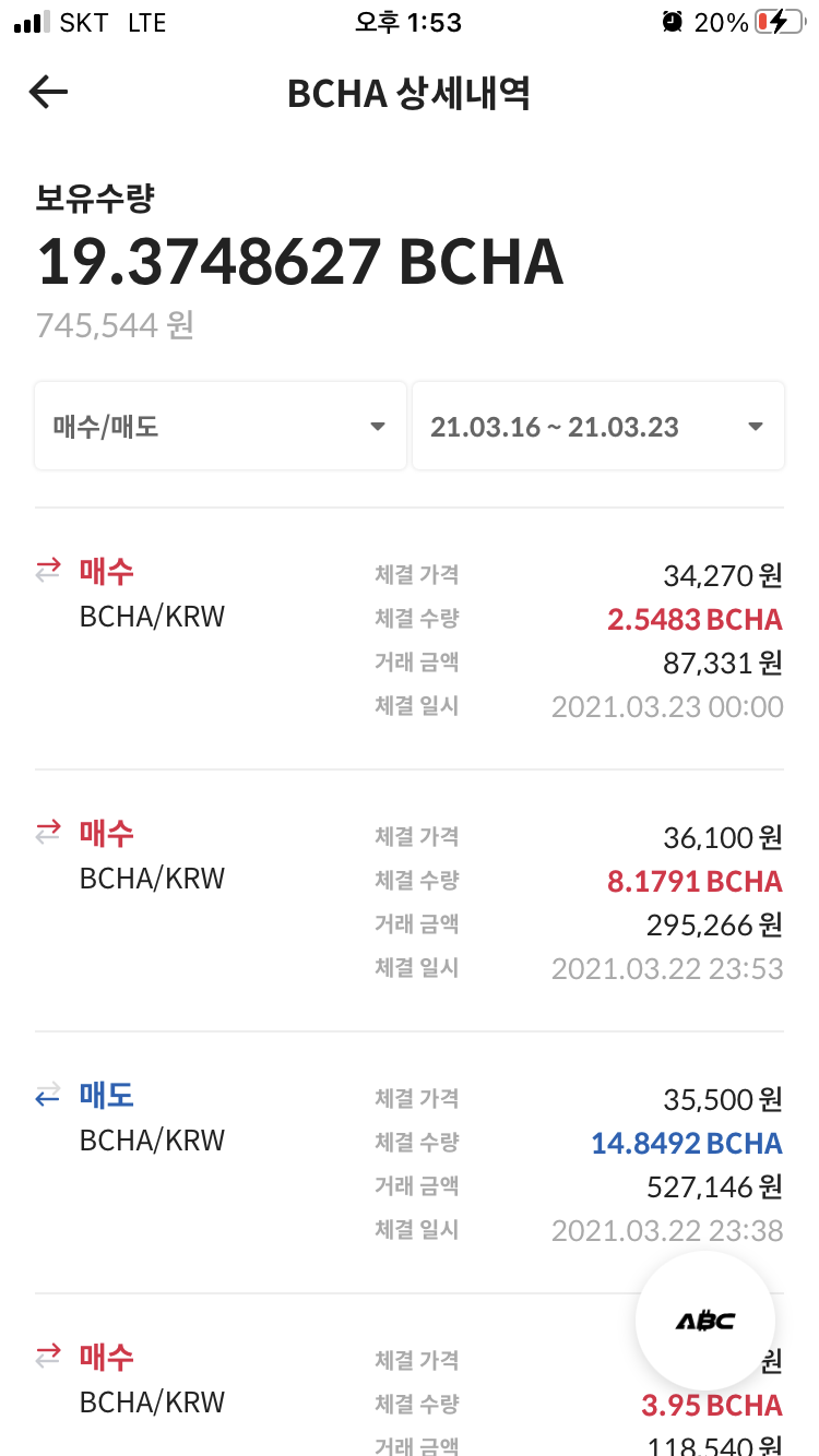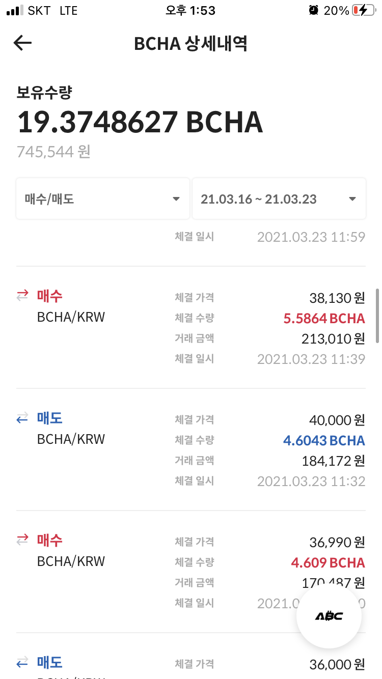 아래는 비트코인캐시에이비씨(BCHA)를 매매한 내역들을 가져와 봤습니다.