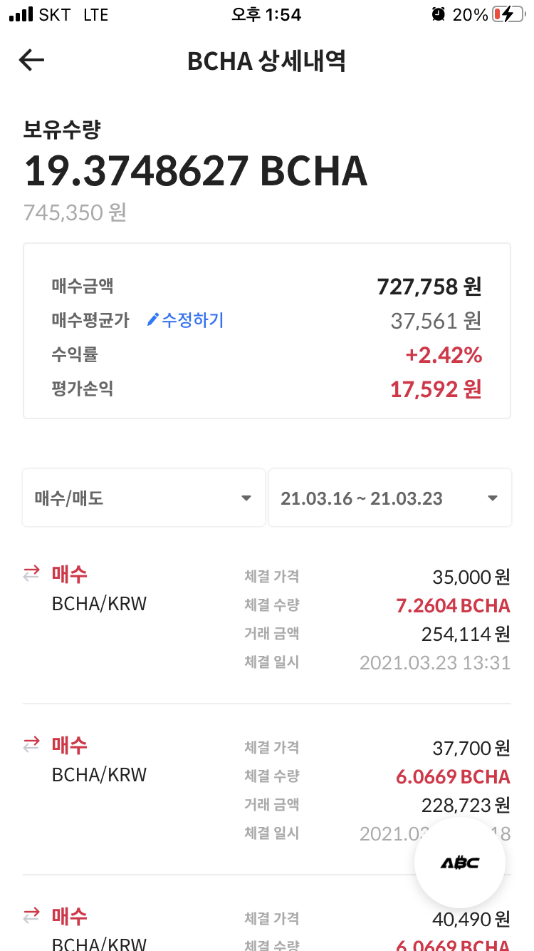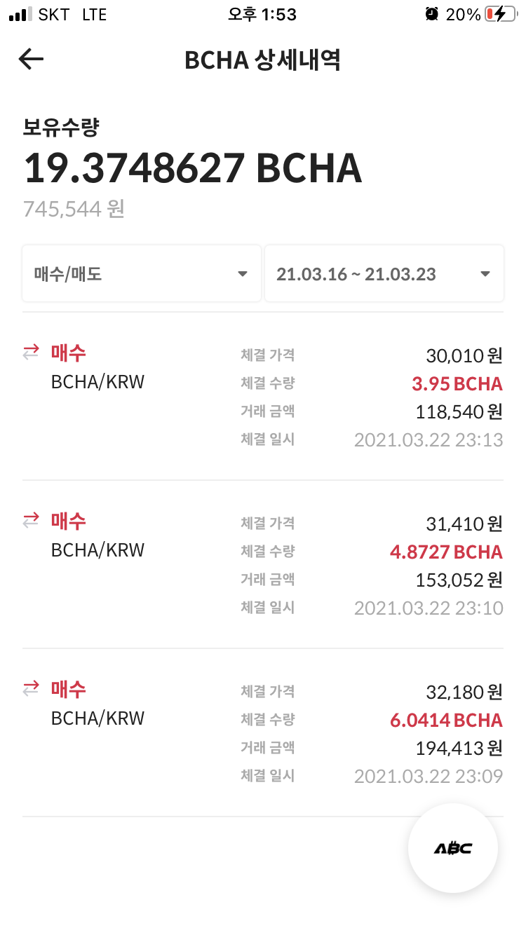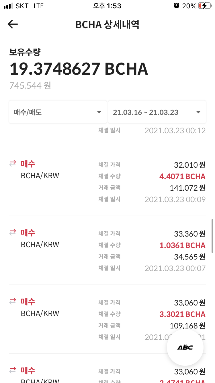 | 1차 - 32,180원 매수 | +6.0414 BCHA | +194,413원 | |