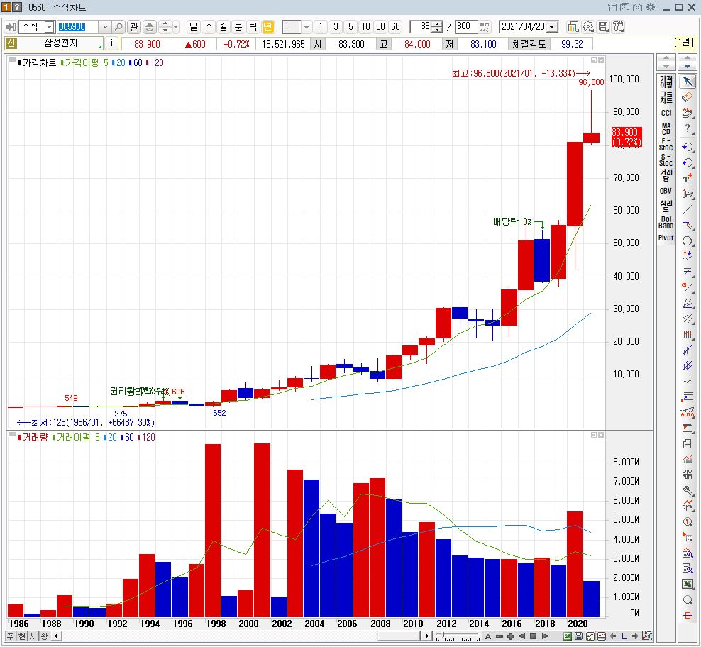 위 주가에서도 보여주듯이 삼성전자는 분명 좋은 기업이고 우리나라를 대표하는 기업이라는 것에 부인할 사람은 없을 것입니다. 그리고 장기간 이런 독보적인 위치를 구가하였던 것도 사실입니다.