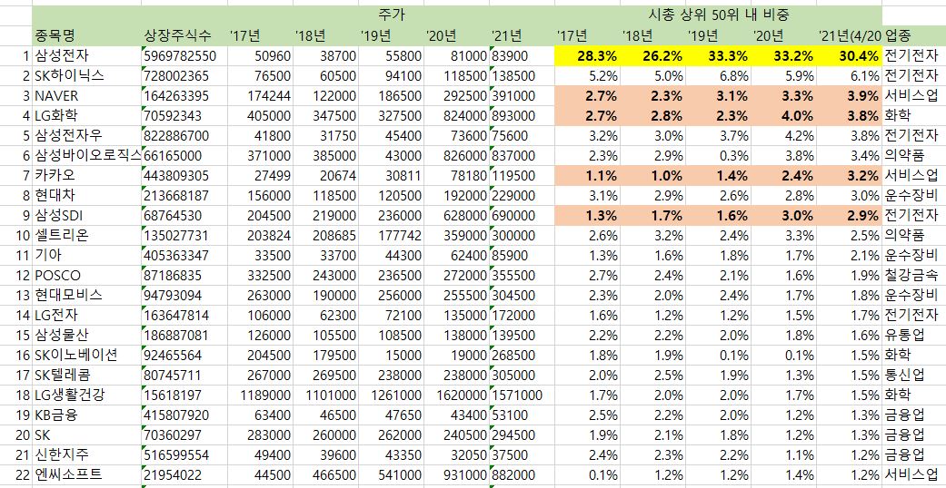 그리고 '21년 4월 현재 삼성전자가 시가총액 상위 50개 종목들 사이에서 차지하는 비중은 30.4%로 3%가 하락하였습니다. 이는 상대적이긴 하지만 삼성전자의 주가가 하락을 했던 것이 아님을 고려할 때 의미있는 결과라고 생각합니다.