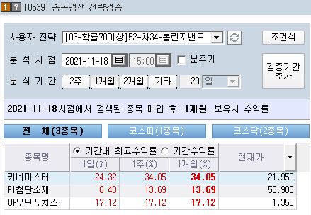위에서 보면 삼아알미늄을 제외하고 나머지 종목은 상승을 가져가지 못했으며, 아무리 확률이 높은 조건검색기를 통해서 발견을 했더라도 어떤 종목을 선별하느냐가 중요한 과정임을 다시 한 번 느낄 수 있었습니다.