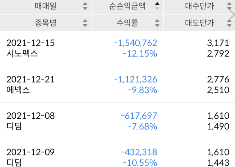 손실난 종목 : 시노펙스, 에넥스, 디딤