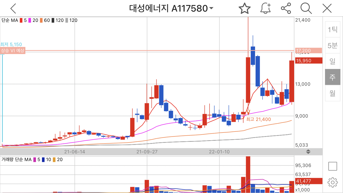 기술적으로 제가 알고 있는 지식선에서 차트분석을 해보면, 대성에너지가 발견된 이후에 주봉 20봉이평 부근에서 주가가 형성되었고, 20봉 이평선 가격대(10,000~11,000원)를 이탈할 경우에는 손절을 준비해야할 것으로 생각을 했습니다.