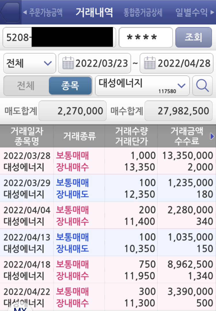 실제 대성에너지의 첫 진입은 13,350원에 들어갔습니다. 상당히 높은 급액이고, 하지만 저 금액에서 바로 수익이 나더라도 만족할만한 금액으로 1차 진입을 하였습니다.