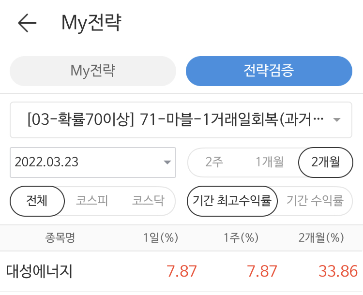 대성에너지는 71번 조건검색식으로 3월23일에 발견된 주식종목입니다. 아래는 실제로 제가 만들어놓은 조건검색식을 MTS(Mobile Trading System)에서 조회를 한 내역입니다. 2개월중 최고수익률이 30%이상 급등한 것을 볼 수가 있습니다.