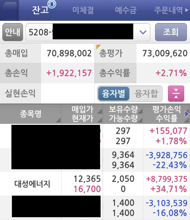 저도 잘하고 있지는 못합니다. 사실 마이너스가 저정도만 나면 멘탈이 흔들릴법도 한데, 대성에너지 사례를 참고하면서 주가관리를 해나가고 있는 과정에 있습니다. 한동안 주식시장이 많이 힘들었기 때문에 과거에 누구나 돈을 벌던 시대가 아니기 때문에 진짜 실력자들만 돈을 벌게되는 시장이 되었습니다.