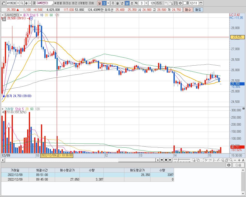 SAMG엔터주는 신규상장주였기 때문에 일봉, 주봉, 월봉의 큰 흐름이 없는 상태입니다. 그래서 분봉을 중심으로 매수타점을 잡기 시작했습니다.