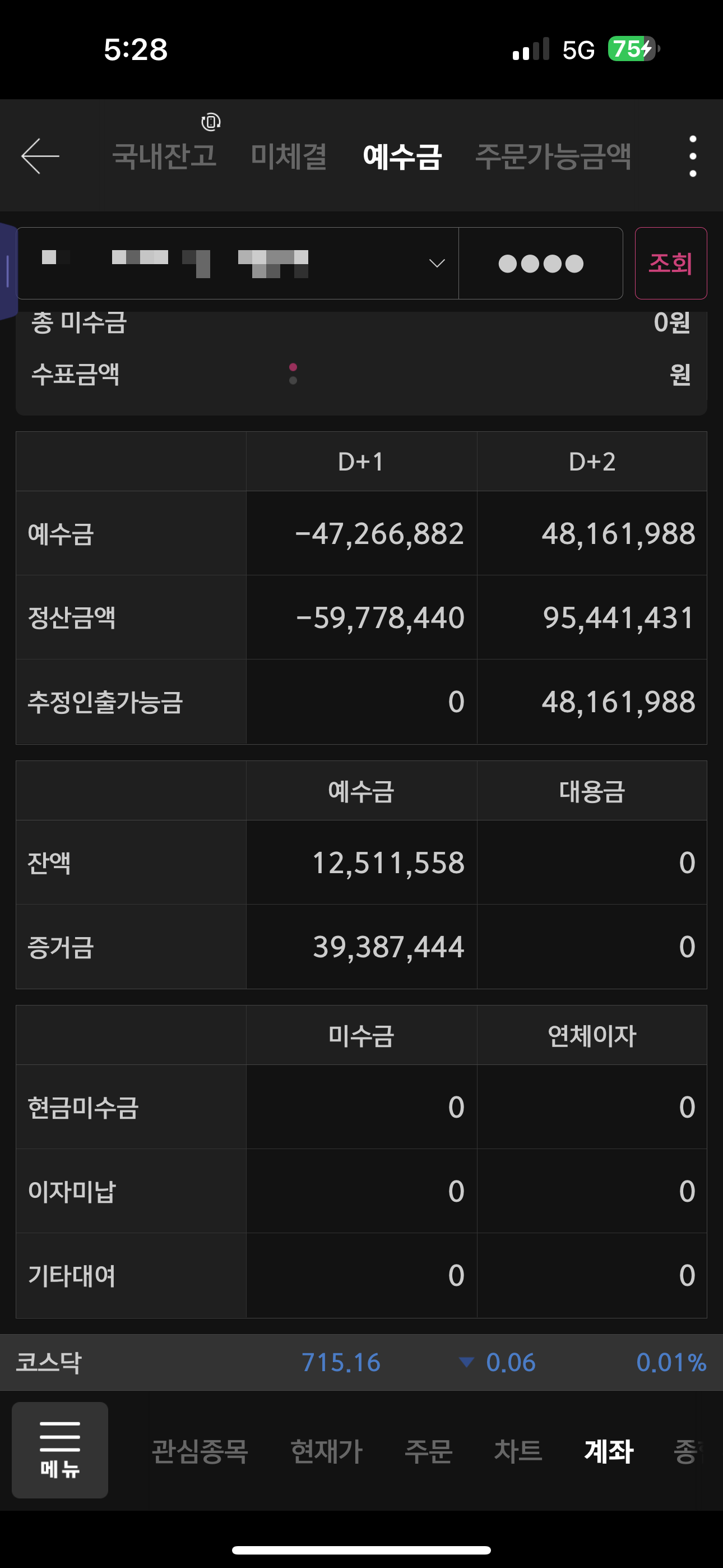 수요일에 갚아야 하지만 목요일에 돈이 들어오는 구조가 됩니다. 이렇게 되면 아래의 왼쪽 그림과 같이 화요일에 내 계좌를 조회해보면 예수금이 마이너스가 되게 됩니다.