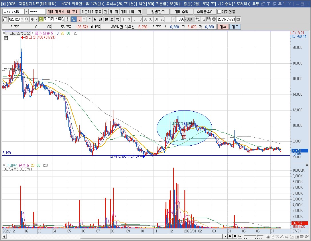 주식종목을 발견하게되는 상황은 여러가지가 있는데, 키다리스튜디오는 엄청난 거래량과 거래대금에 의해서 알게되었고, 매매를 해야겠다라고 결정했습니다. 위 차트에서도 보시면 엄청난 거래대금이 몰려있는 것을 확인할 수 있습니다.