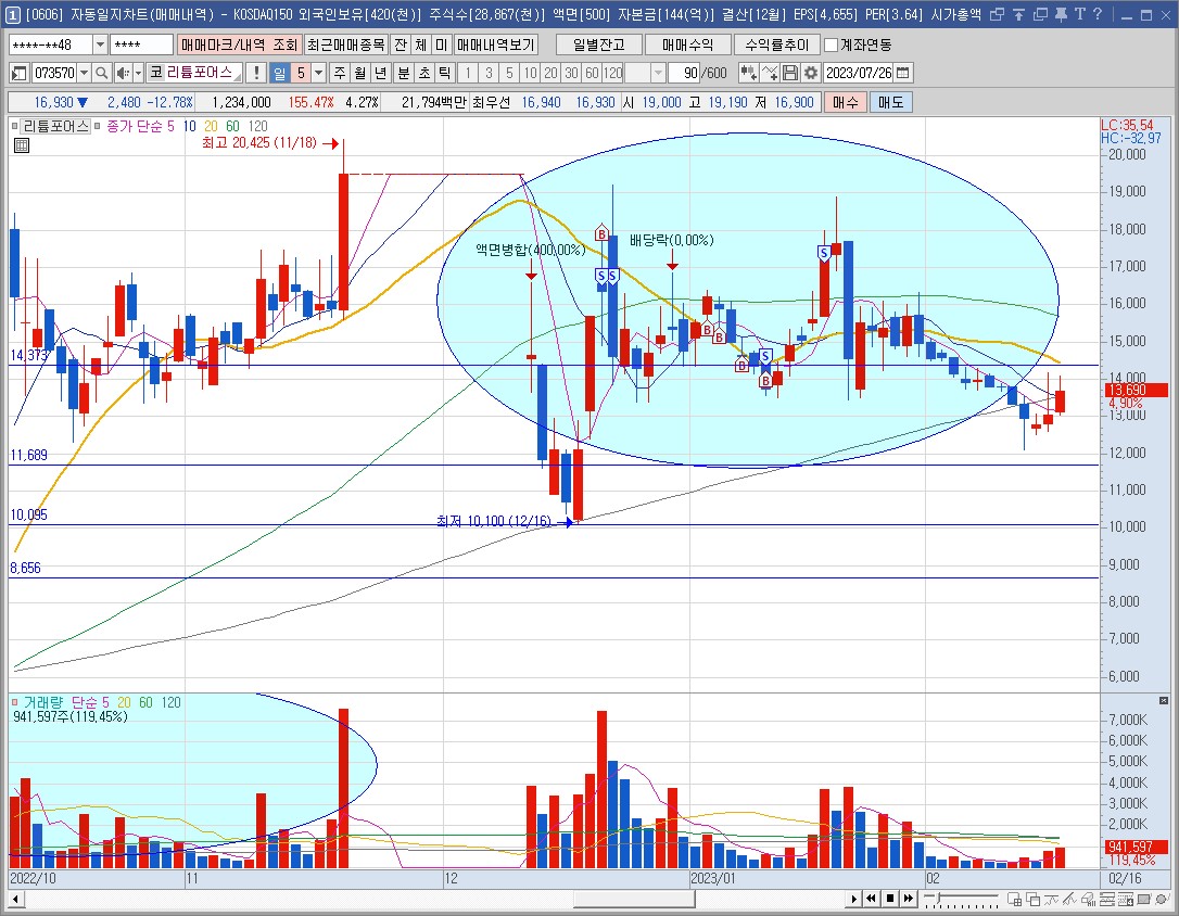 다시 하락세를 보이자 14,000원부근까지 추격매수를 진행한 것을 보실수가 있습니다. 그리고 지지를 받고 올라감과 동시에 장대 양봉이 출현한 날 전량 매도를 진행하였습니다.