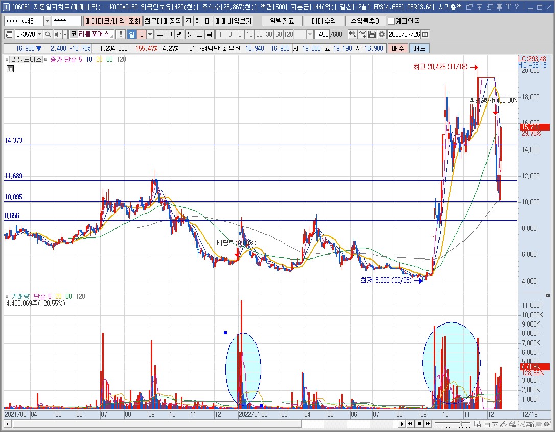 그리고 차트아래 거래량에서도 보이듯이 리튬포어스의 거래량이 21년부터해서 지속적으로 늘어나는 것을 볼수있습니다. 누군가는 22년에 5,000원에 매수를 해서 35,000원까지 7배가량 수익을 얻은 사람도 있을 것입니다.